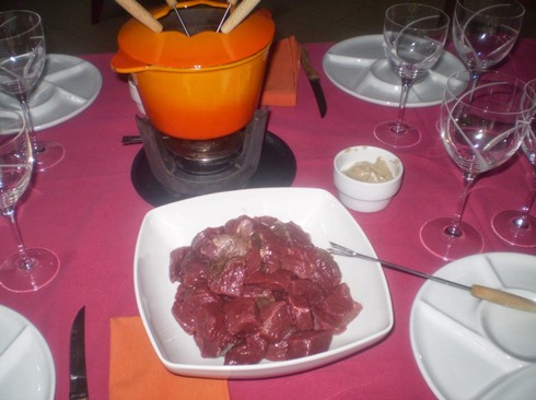 Pour la fondue faire chauffer votre huile avec le thym et le laurier dans un caquelon au début sur le gaz puis quand vos invités sont à table vous pouvez le mettre sur le réchaud en enlevant le thym et le laurier.